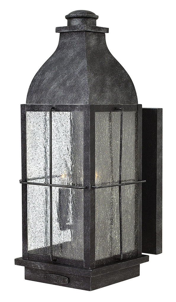 Bingham’s traditional style recalls a turn-of-the-century gas light reproduction. The vintage look is nautical in nature and recognizes Hinkley’s origins on the shores of Lake Erie. The aluminum construction features clear seedy glass and a Greystone or Sienna finish, while candelabra bulbing completes the authentic style.