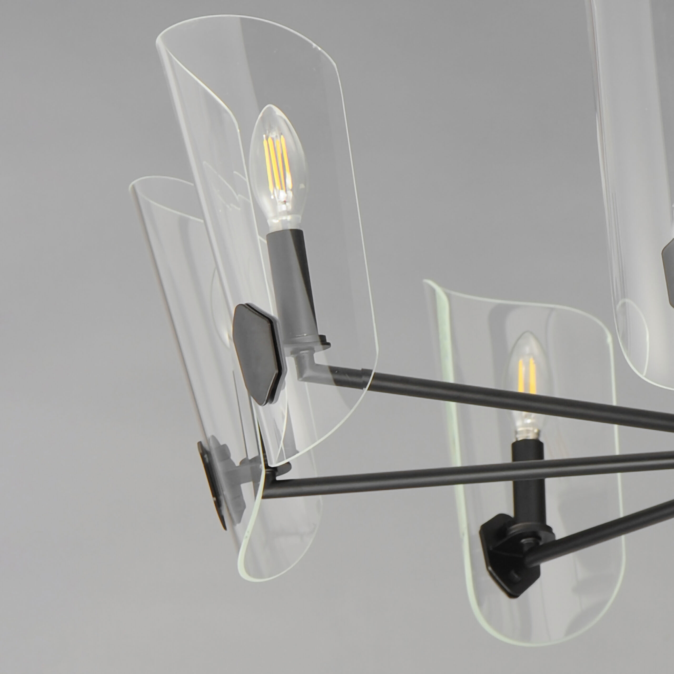 A Coat of Arms in curved Clear glass shades bevel cut and shaped to resemble traditional shields radiates off slender tubular arms. The streamlined design takes on a transitional approach with imaginative details that carries through to the concept for the wall sconce. Available 2 sizes of chandelier and a single light wall sconce in either Matte Black or Natural Aged Brass.