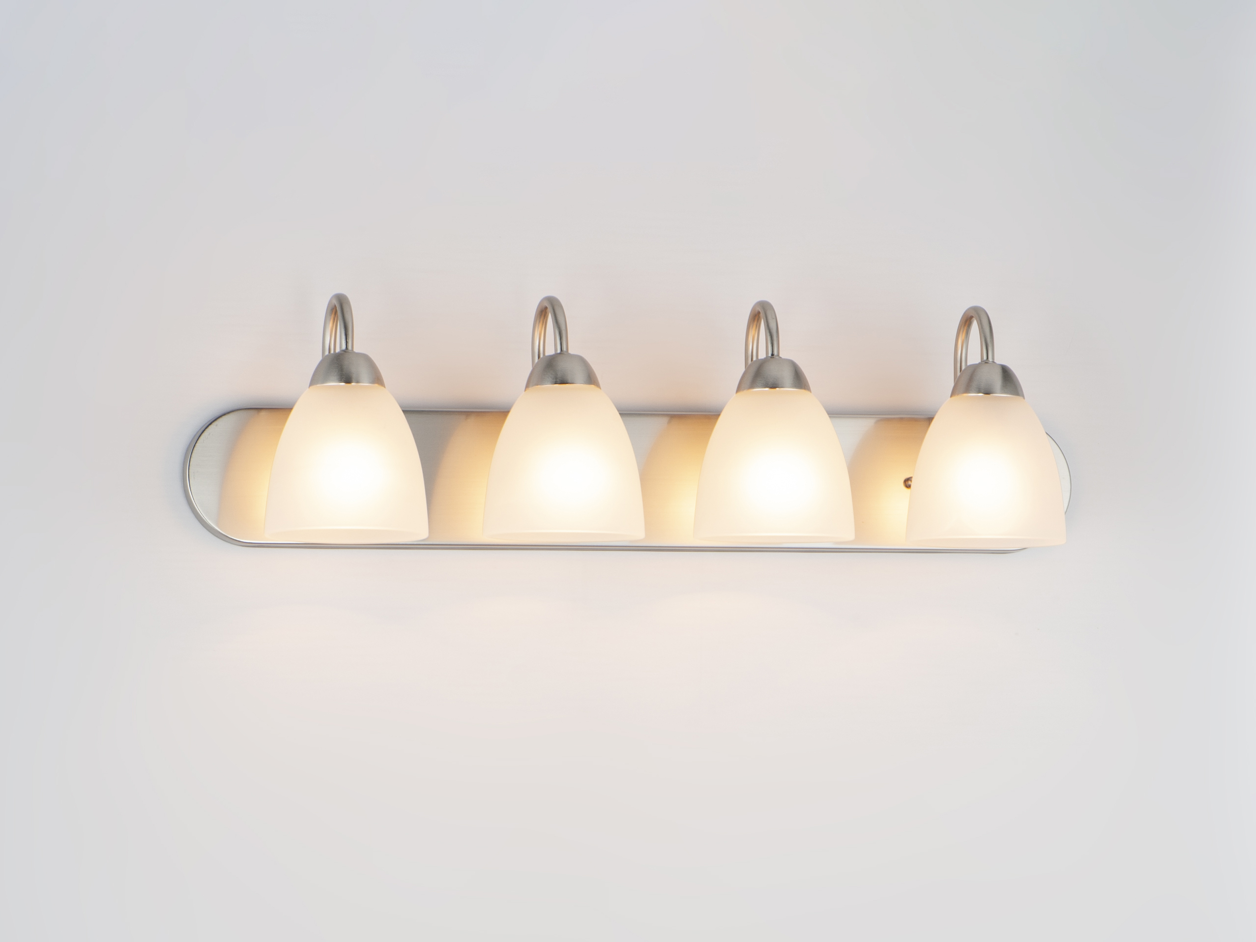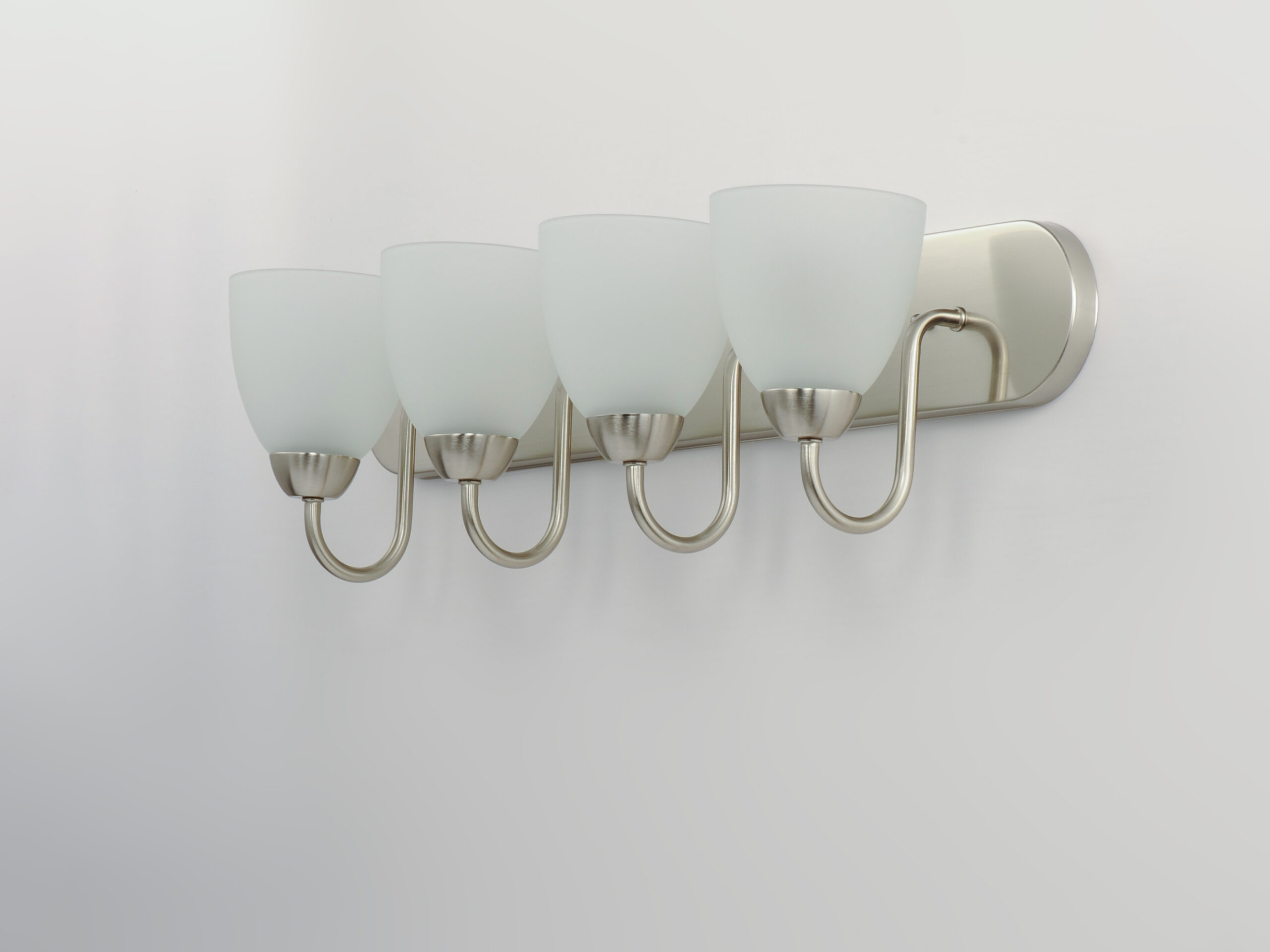 This transitional design works in any style home. Full length oval backplates support simple bell-shaped, Frosted glass shades. Available in Satin Nickel, Matte Black, and Polished Chrome.