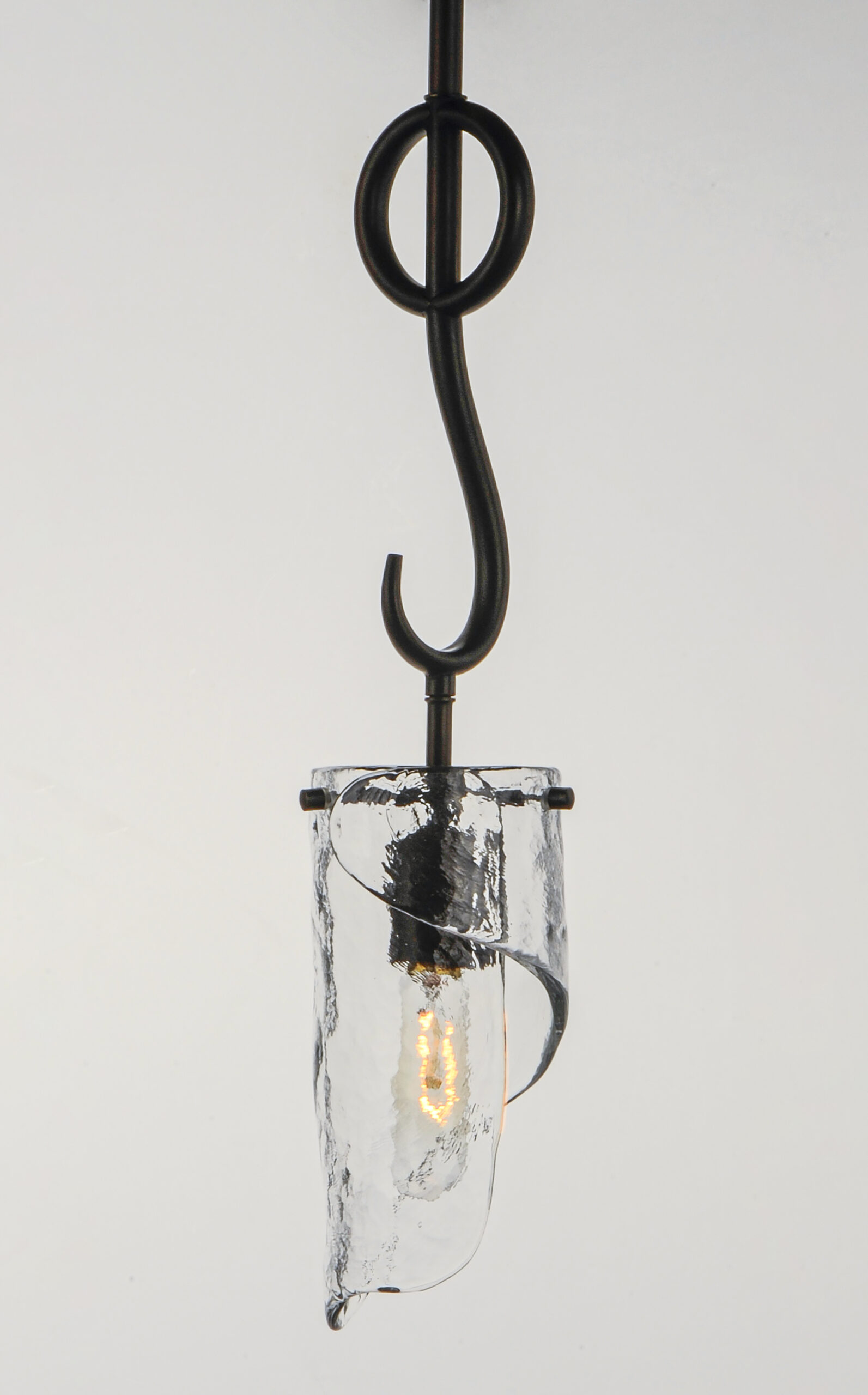 Forged arms finished in Chestnut Bronze are suspended in a mobile-like fashion to create an interesting work of art. Suspended from the hook at each end are beautiful hand formed Clear piastra-styled glass which adds elegance to this bold design.