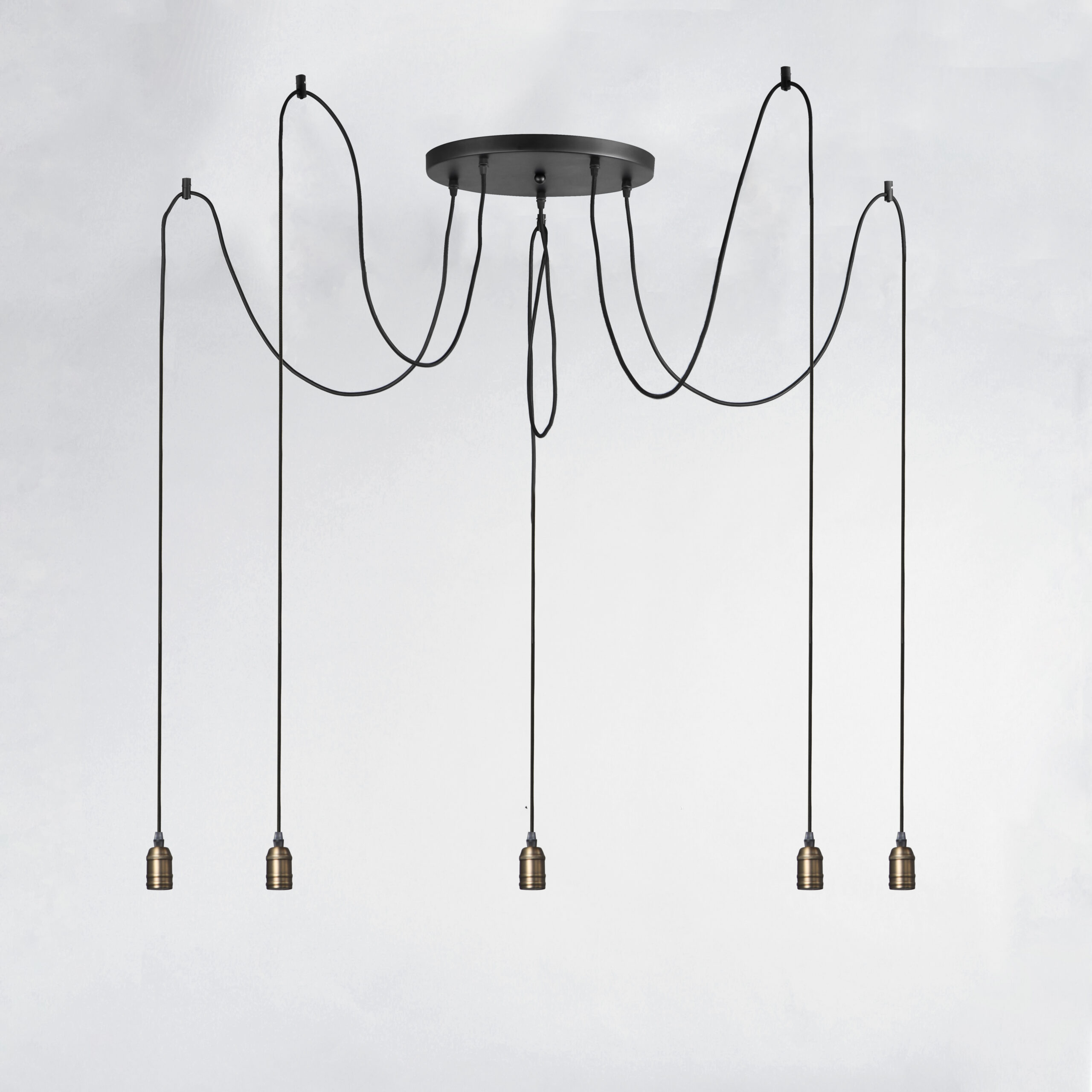 Cords of Black fabric support metal sockets finished in a natural Antique Brass allow you to create unique and fun lighting. All except the single pendant are supplied with hangers that attach to the ceiling to allow you to swag each socket. There are a number of optional bulbs to choose from.