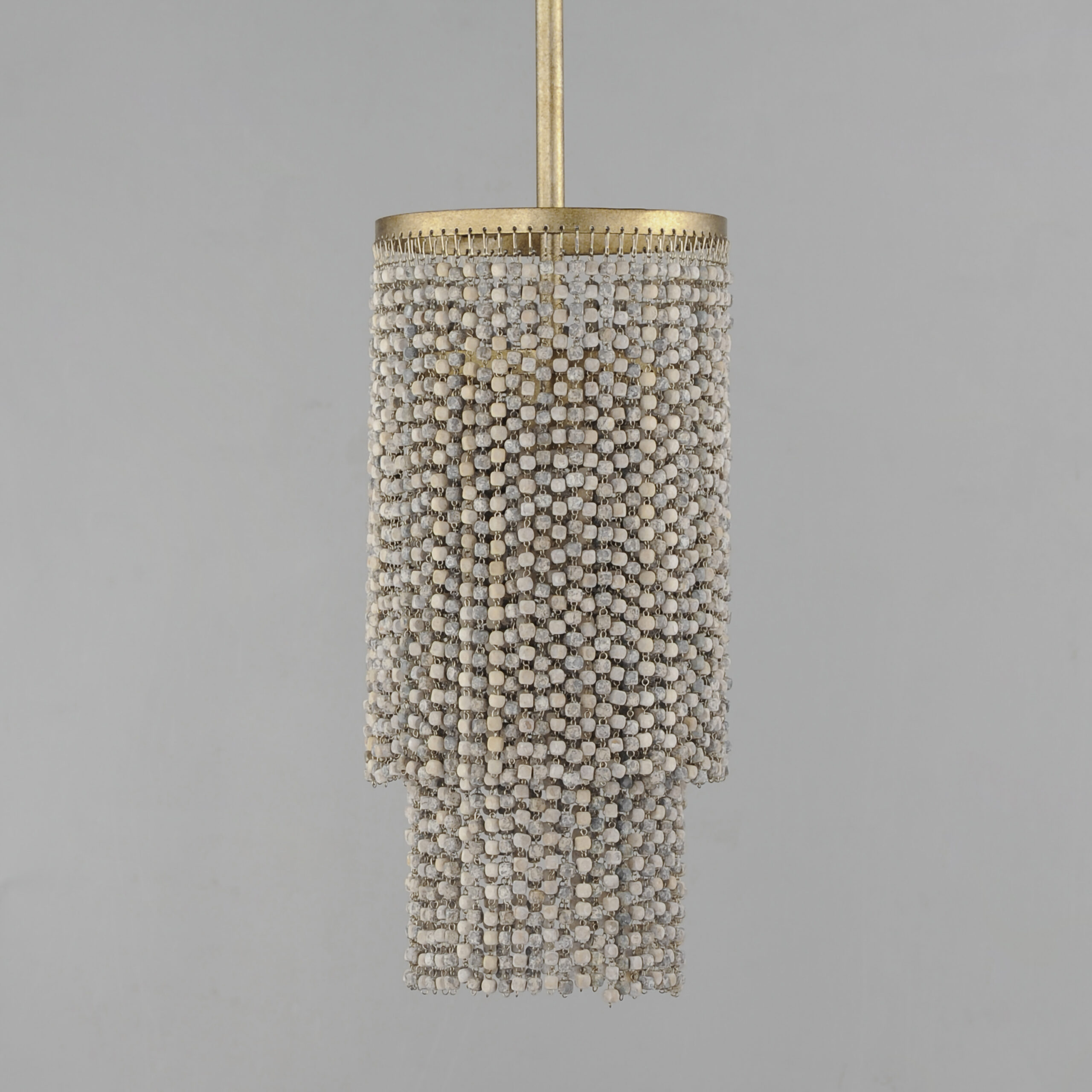 Cascading strands of square Weathered Wood beads are suspended on an offset spiraling frame finished in hand-applied Golden Silver leaf. The craftsmanship of the design is complimented by the soft glow of light within adding ambience to any space. Available in two sizes of pendants, a semi-flush mount, linear chandelier and large wall sconce.