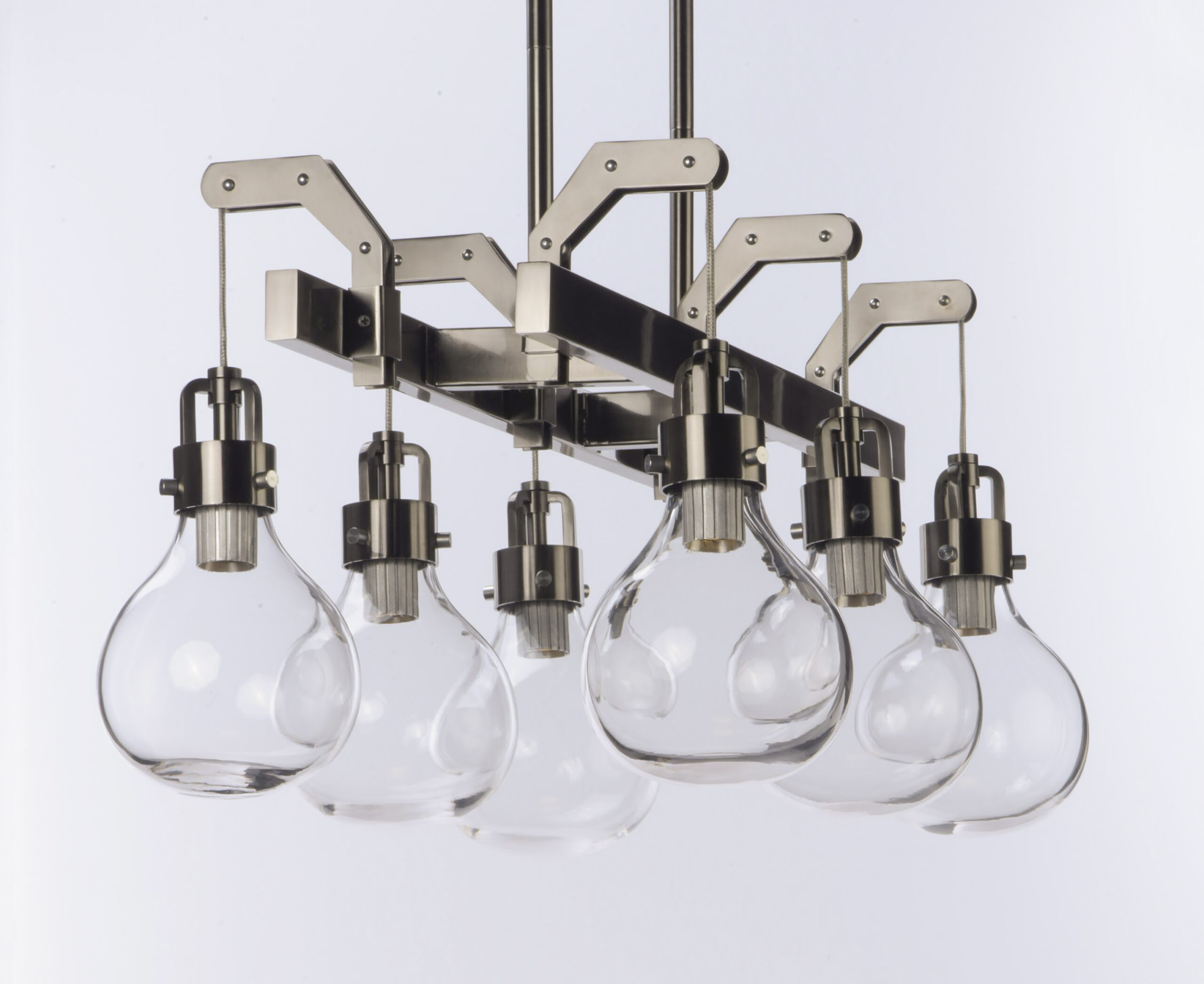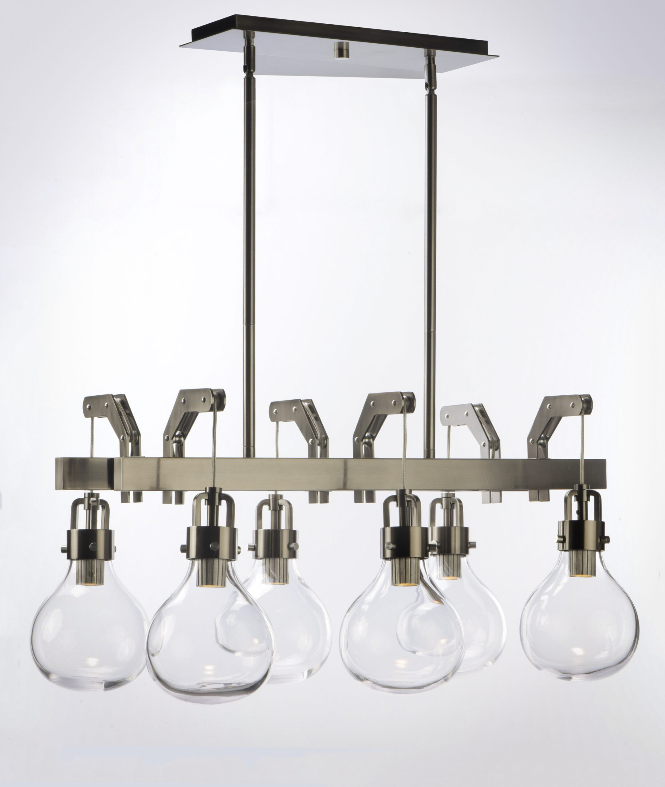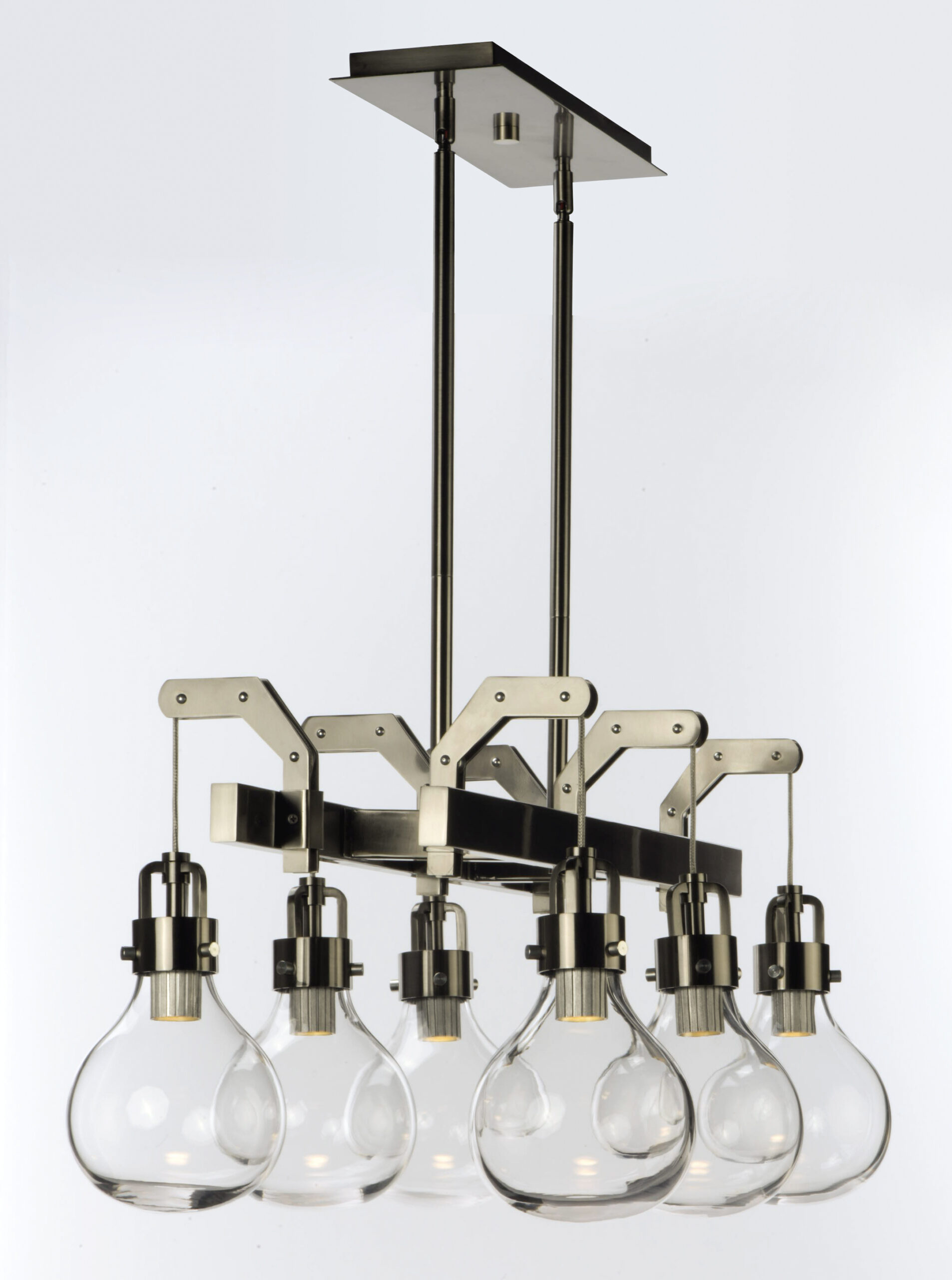 Contemporary Industrial design is met with the Kinetic series transforming mechanical parts into beautiful metal components finished in Dark Satin Nickel. Wire cord is run along a truss like structure separated by transformer-like castings. Large Clear glass globes are suspended from brackets with recessed LED illumination coming from decorative heat sinks.