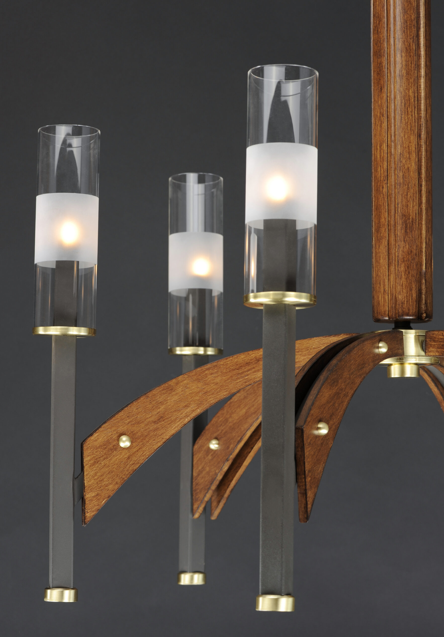 A modern classic created using mixed medium in complimentary finishes that come together to compose a beautiful art form. Available in your choice of Wenge wood with Black and Polished Nickel accents or Antique Pecan wood with Bronze and Satin Brass. Tall Clear glass cylinders with a frosted band complement the scale of the design.