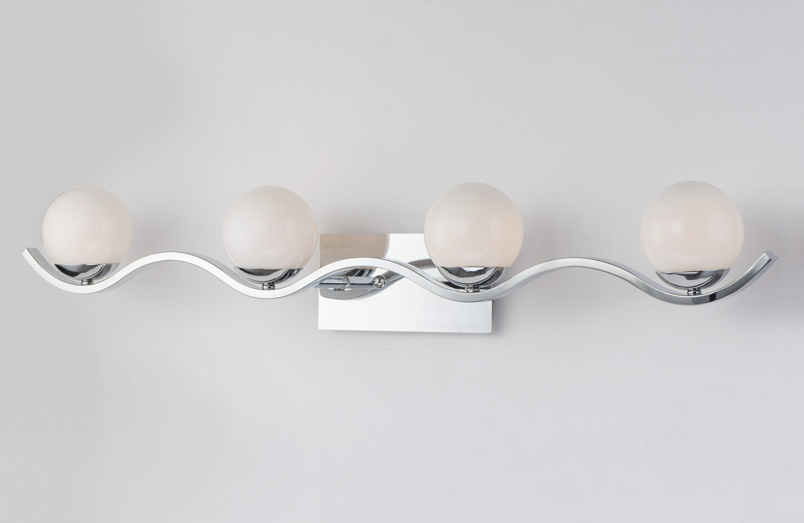 Opal White glass balls suspend from a wave like metal arm finished in Polished Chrome. The clean contemporary design provides excellent illumination and classic design appeal. Brackets can be installed either glass up or down.