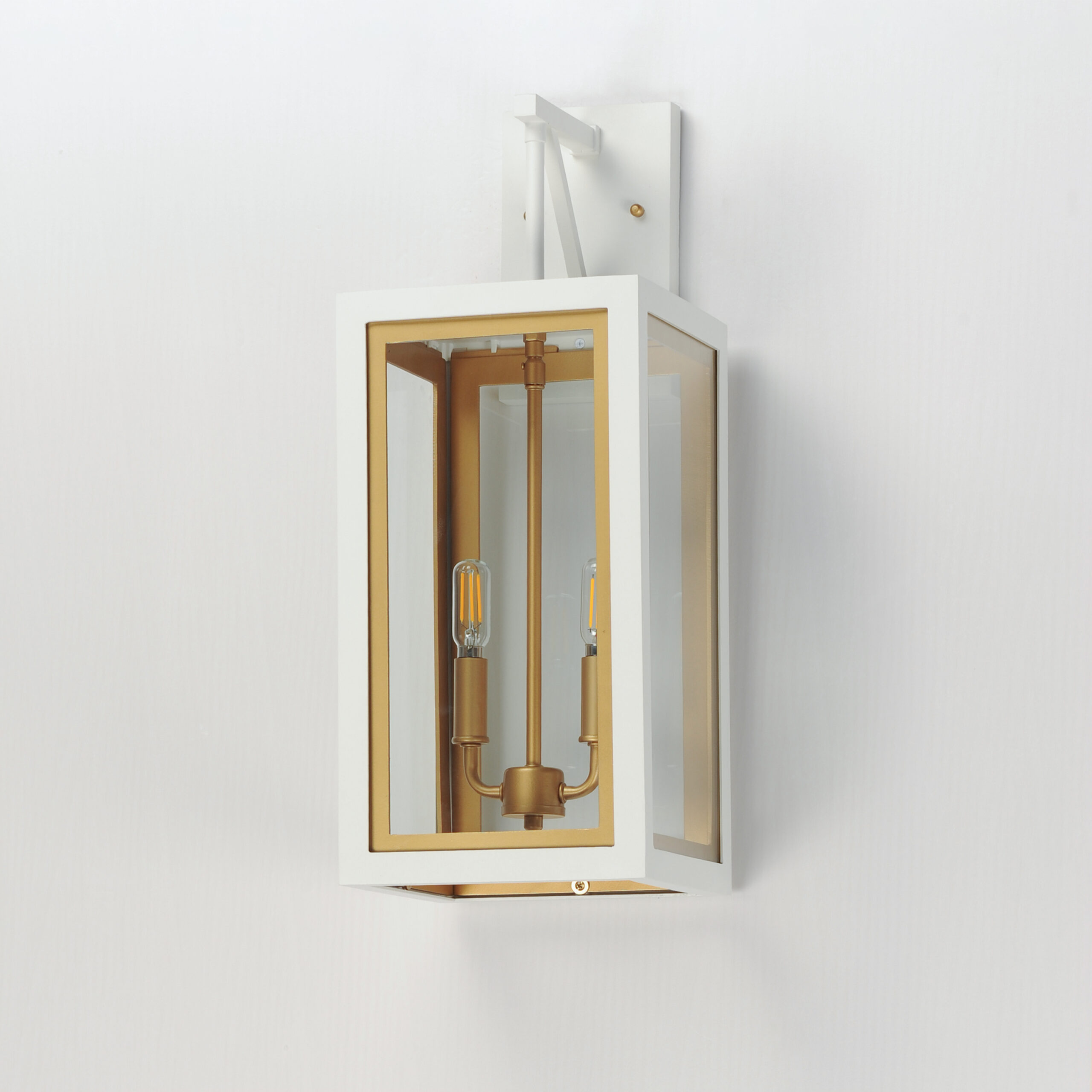 Two-tone frames of Black or White with internal Gold frames provides a neoclassical approach to the squared coach lantern. The sconces jut out from the wall on well-defined trusses that add a contemporary element. Delivering a classic design that suits most exteriors, this collection adds interest in the interior contrasting frame of Gold that secures clear glass panes to diffuse the lamp within.