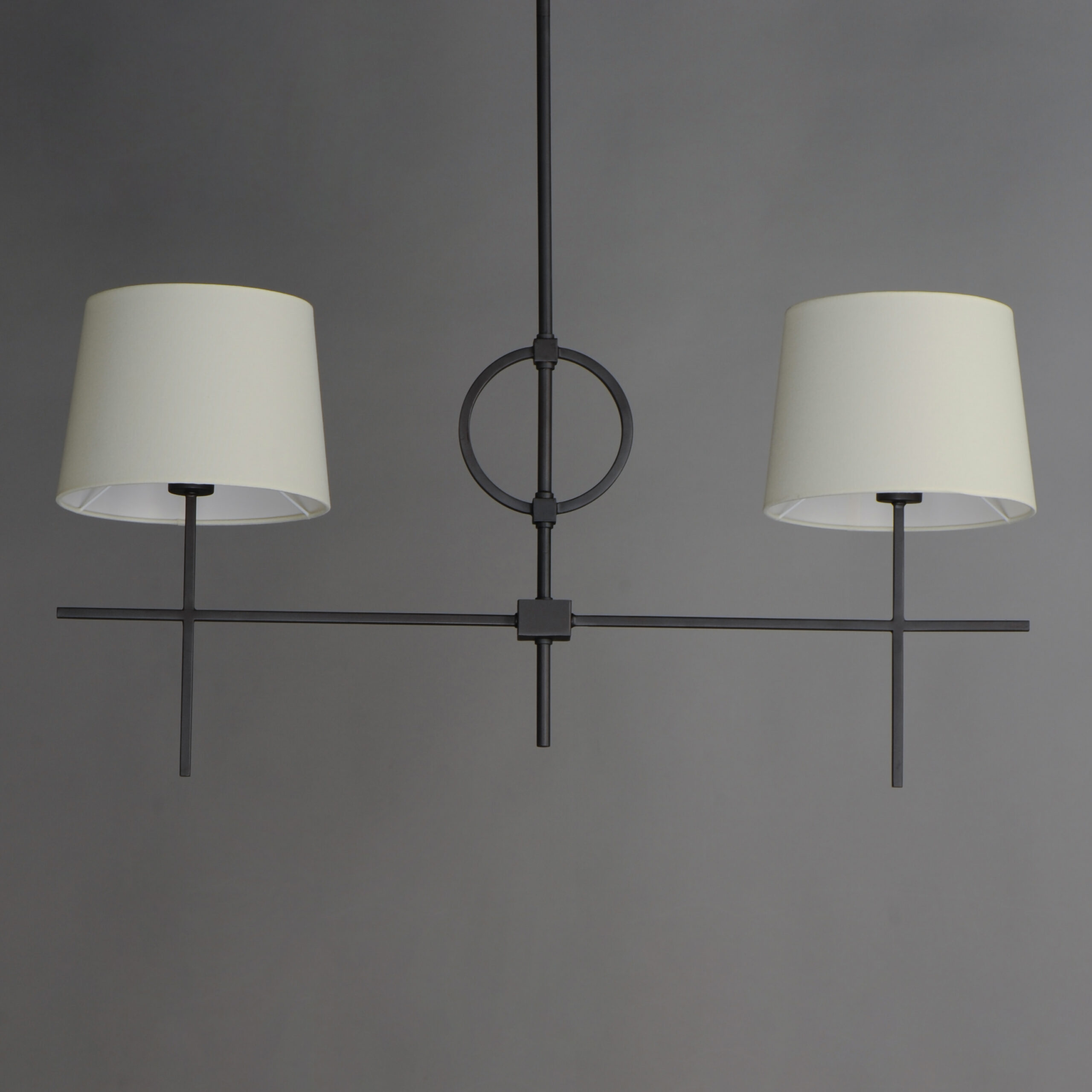 A clean frame with an oversized ring detail is finished in Charcoal Bronze. Featuring oversized Off-White Linen shades on two configurations of pendants, the collection also includes a two-tier chandelier and wall sconce.