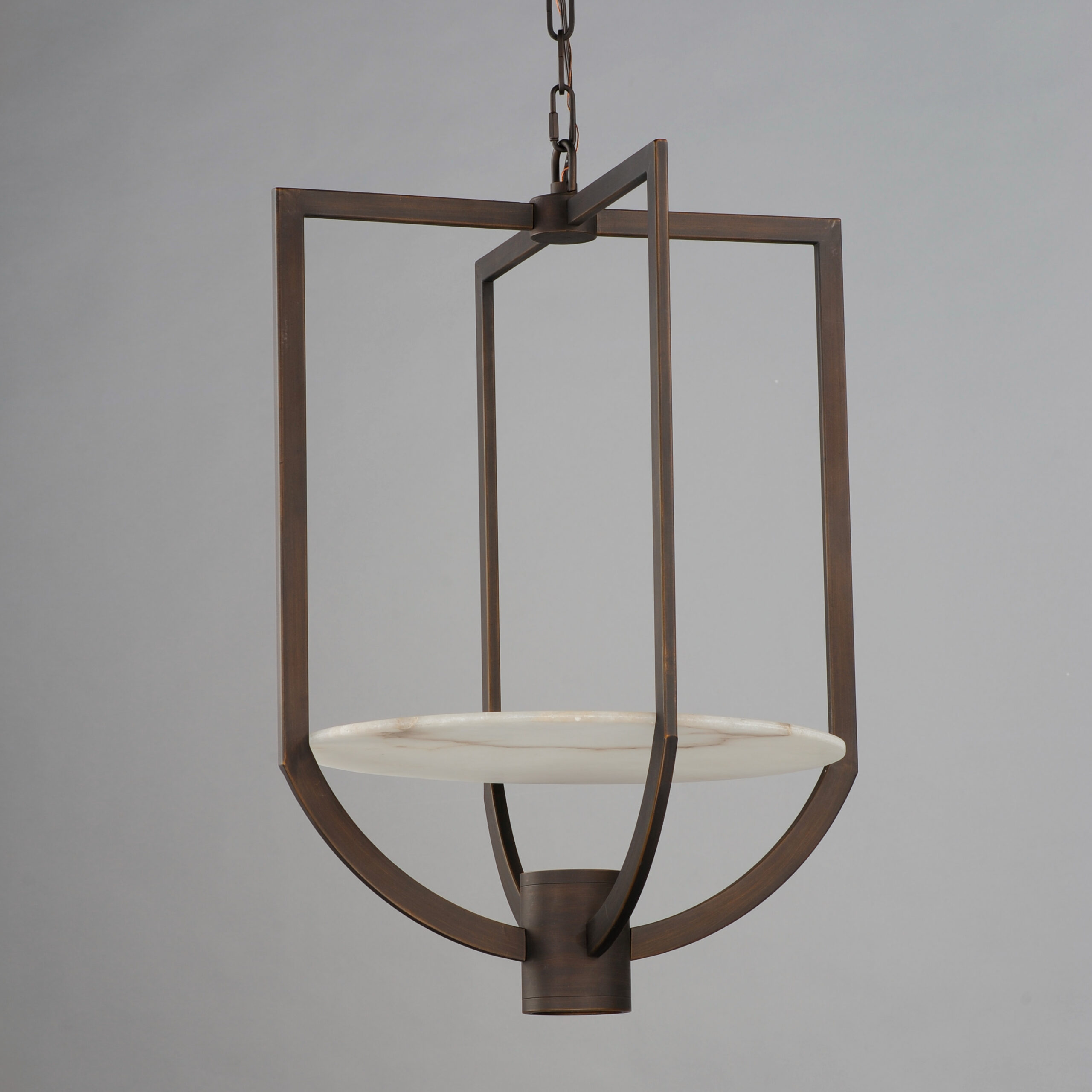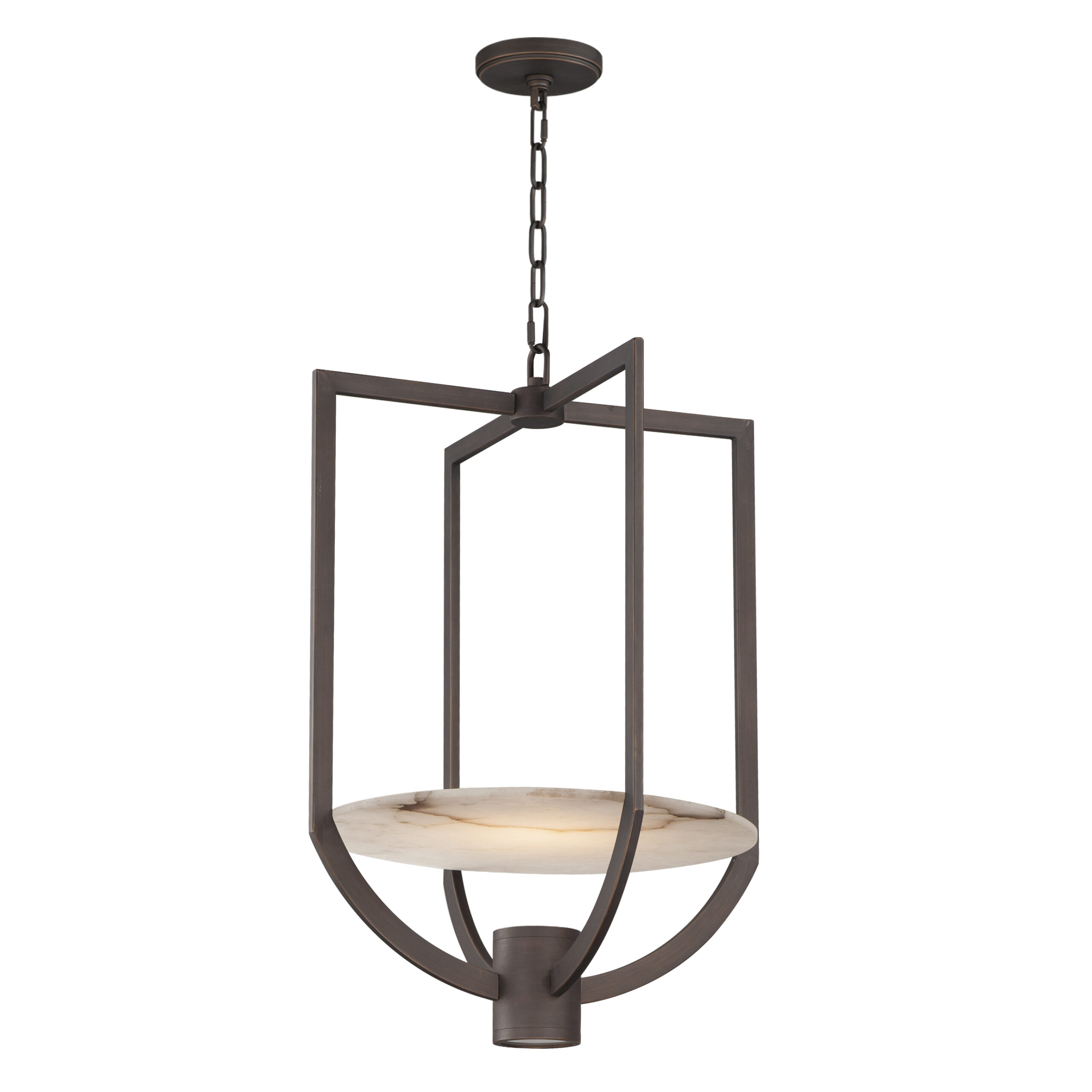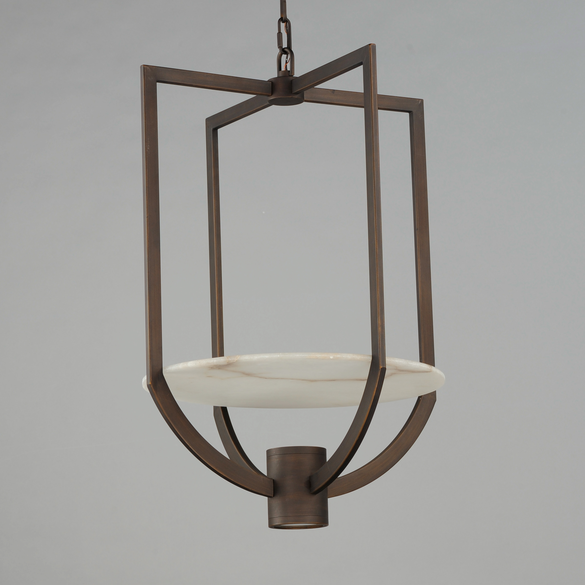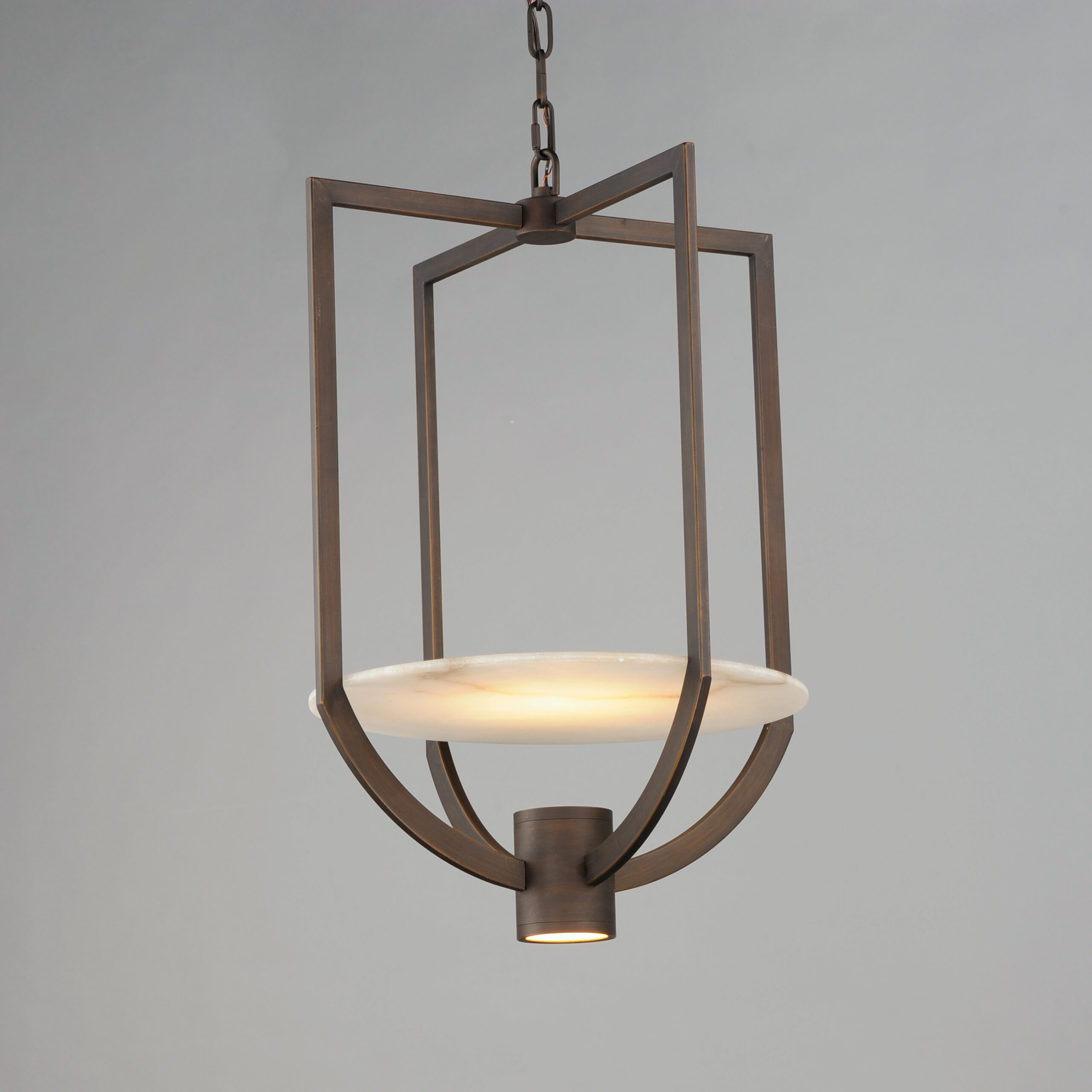 Modern in execution, yet representative of the classic inverted bowl pendants, the Quarry collection features natural Spanish alabaster in an iron frame finished in Darkened Bronze. An inverted bowl form is created using the alabaster’s straight line and the empty space below it. Slim housings of LED direct light both up at the alabaster to highlight the stone’s character and another direct light downward for functional use below.