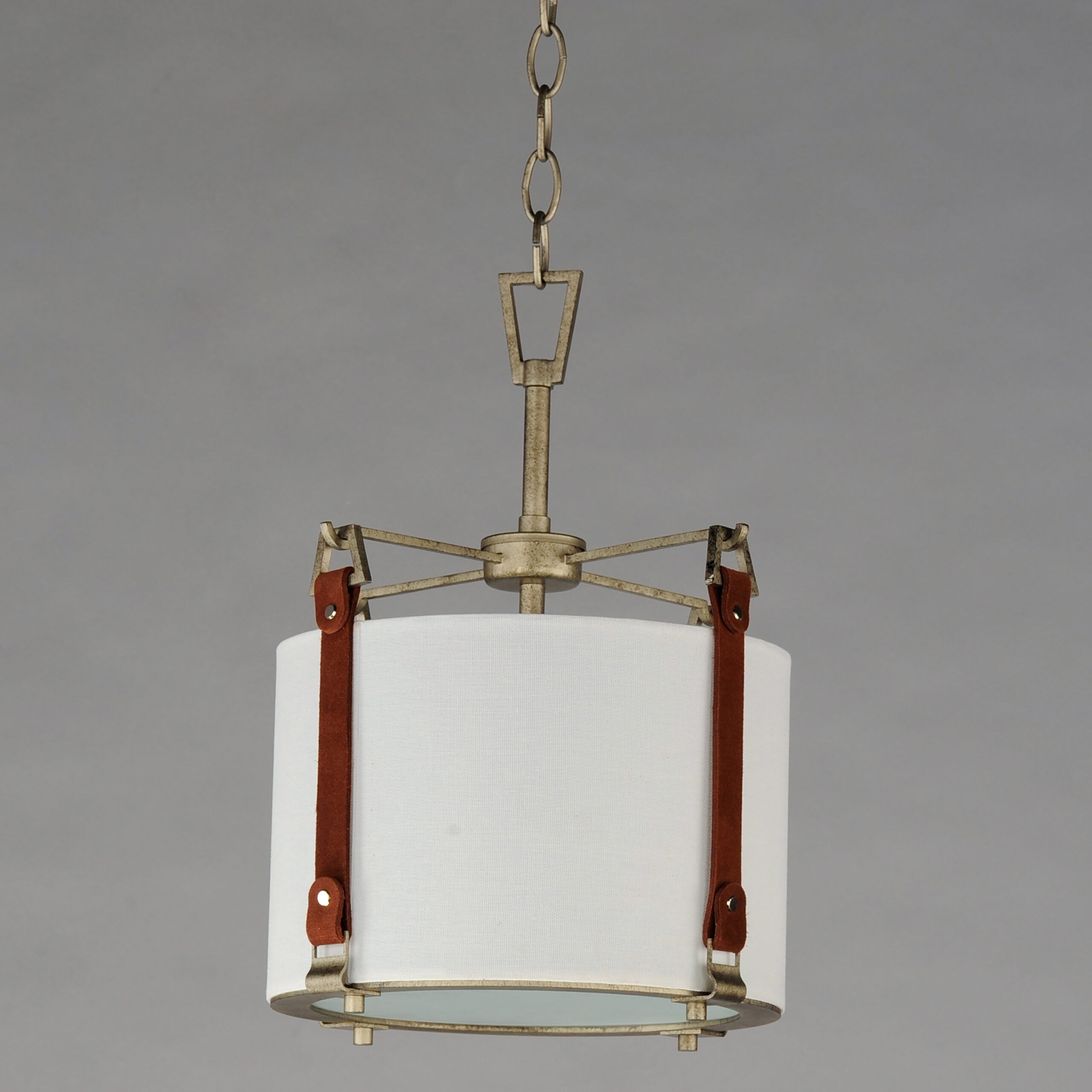 Inspired by the artist enclave north of San Francisco, pastoral elements influence this series of drum shades. Stirrup-like hooks support genuine suede straps in a Tobacco Brown finish which in turn suspend drum shades in an Off-white linen fabric. Metalwork in a hand-applied Weathered Zinc finish frame the frosted glass diffuser at the bottom to softly diffuse the lighting within. Head out West with this rustic, yet refined design.