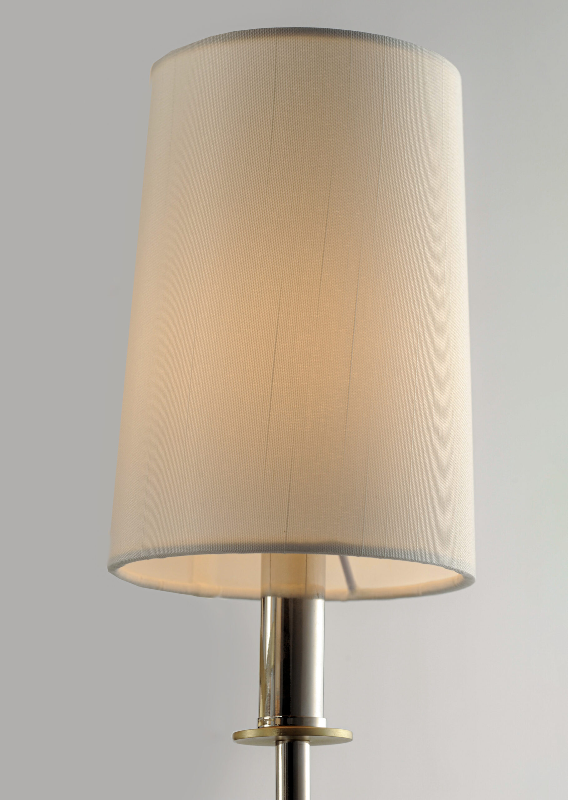 Elongated tails and candle sticks create effortless sophistication in the Uptown series. The slender candles of Polished Nickel contrast the stout supporting arms finished in a soft Satin Brass. Tall Off-White fabric shades complement the updated classic design. The simplicity of this design allows it to pair with various traditional to contemporary stylings and many color themes.