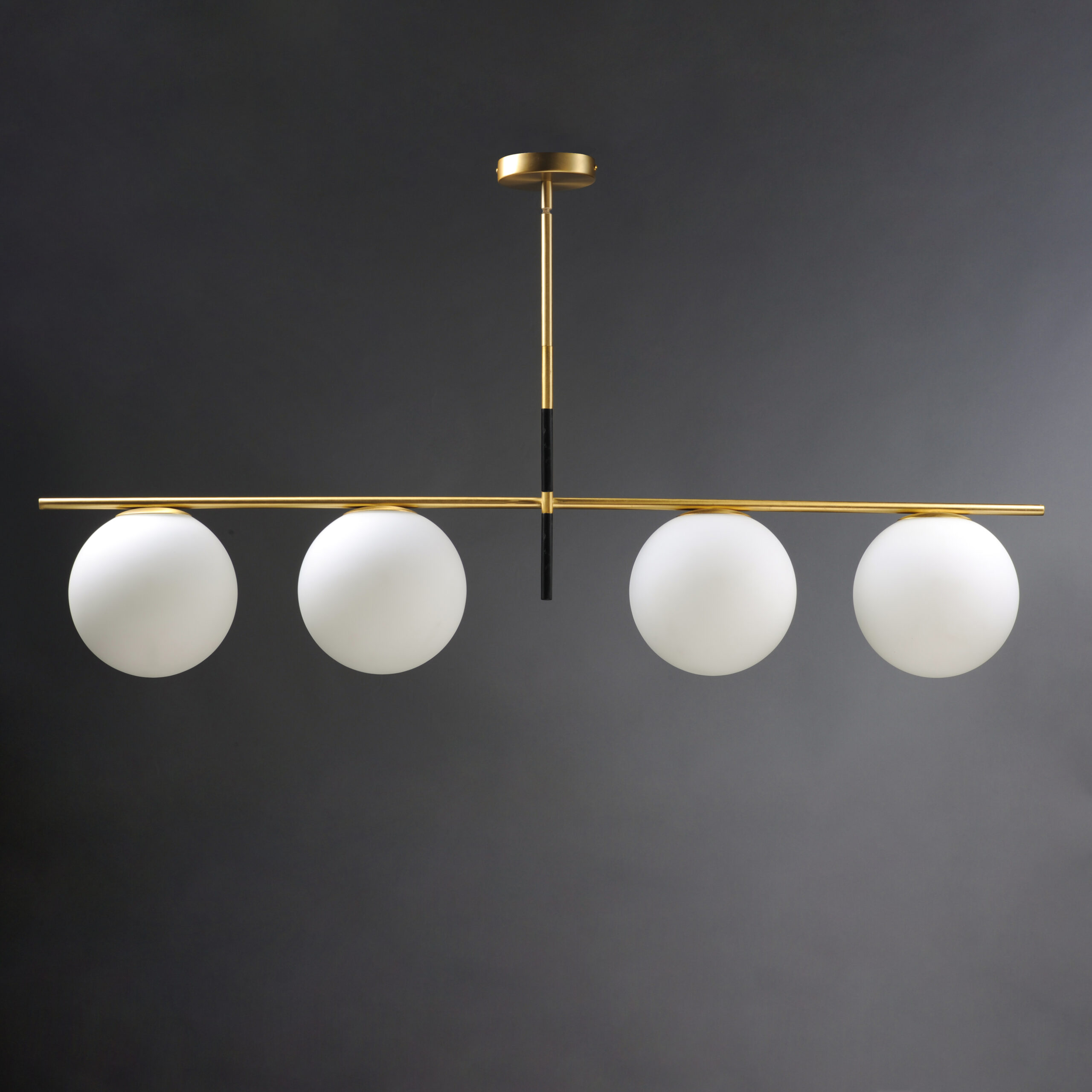 Inspired by both Mid Century Modern and Scandinavian Contemporary this collection spans a large breadth of today’s interior design. Straight tubing finished in Satin Brass supports hand blown Satin White cased glass globes. Black accents of metal and Black marble add dramatic detail and upscale appeal.