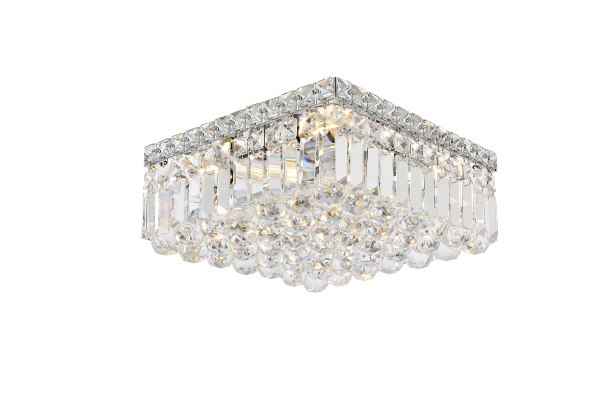 A riot of shapes and textures, Maxime collection flush mounts sparkle in a mosaic of crystal tiles. Square and rectangular precision-cut crystals form the flamboyant exterior while faceted crystal balls create a bubbled effect for light to shine through beneath. Available in a chrome finish with clear crystals, these lamps are a luxurious addition to a kitchen, stairwell, foyer, or living room.
