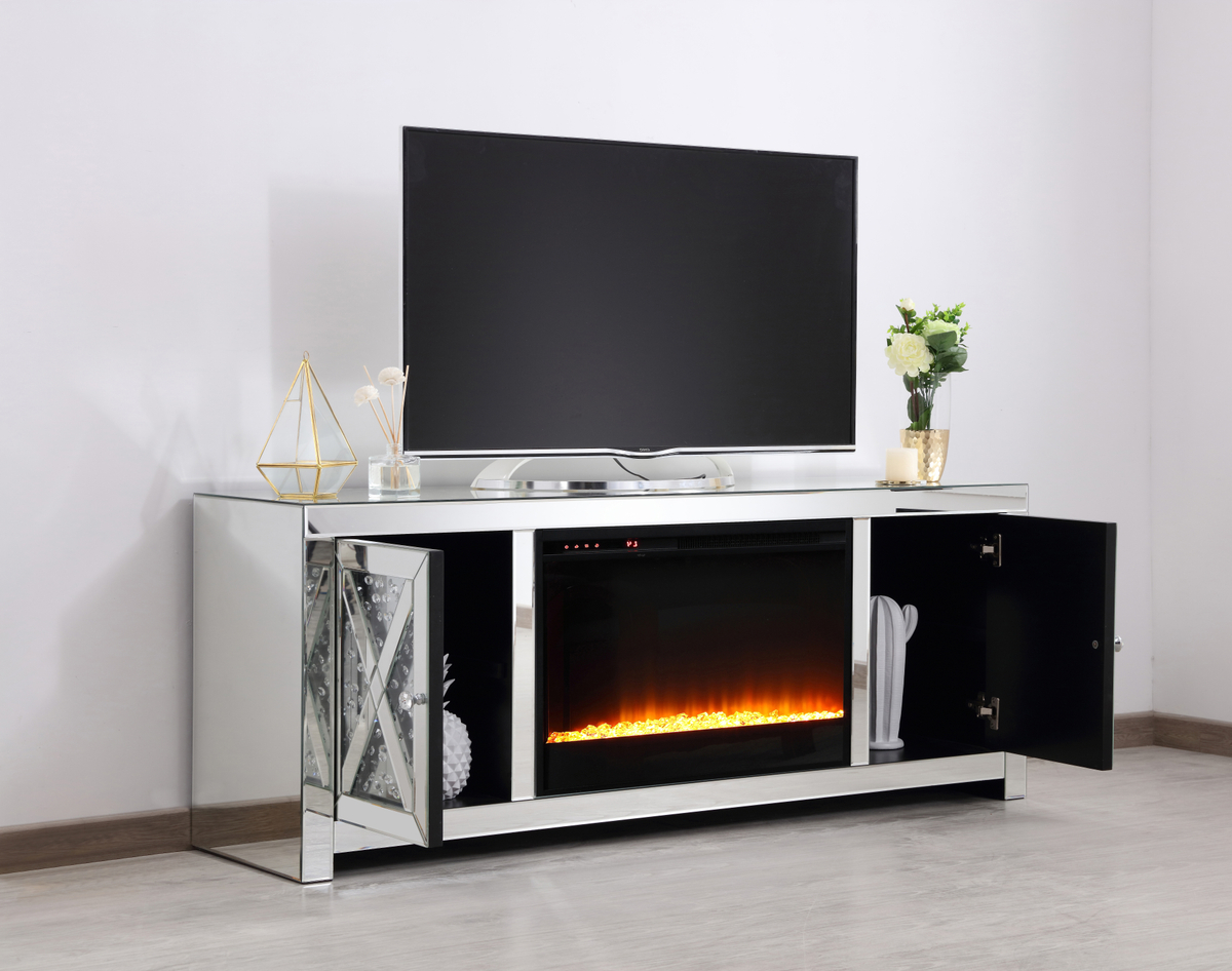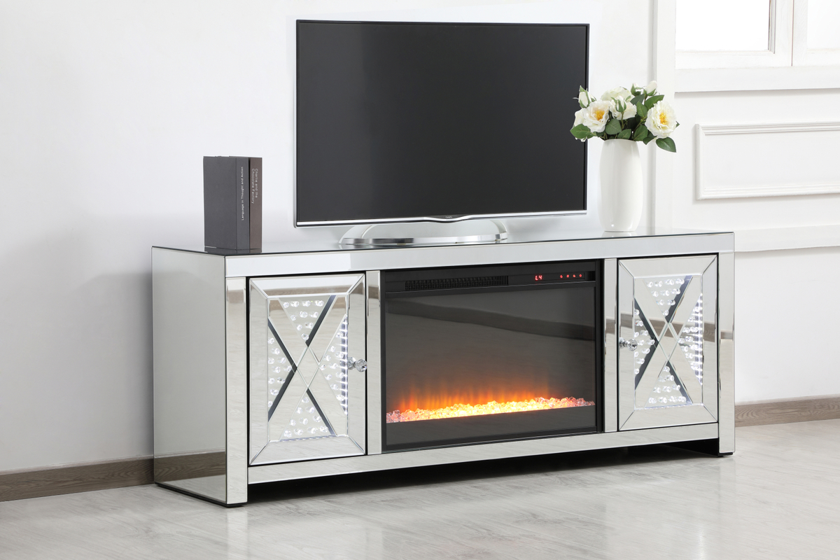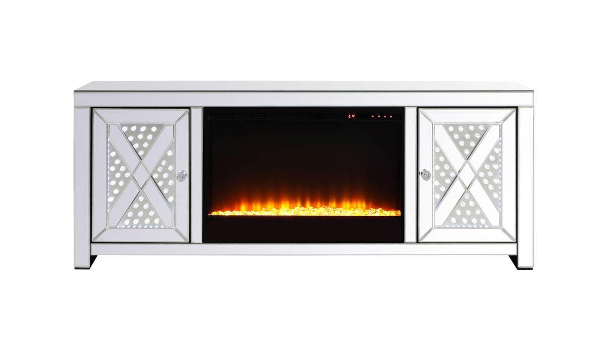This mirror paneled tv stand is the perfect complement to your entertainment spaces. You can enjoy watching endless movies, host premier nights, or play video games until the stars are sparkling just as bright as the clear crystals that embellish the panels within the X-shaped details of the cabinet doors, which opens to reveal a storage area that is the perfect place to put away board games and various trinkets. Touch the on/off button to illuminate the integrated led shining at a cool temperature of 5000K. Hold the button further, the led light will dim to your preferred ambience. Use the remote to turn on the wood log fireplace to bring warmth to your home. Video game consoles and players can find a cozy spot in the middle storage area, or you can place books to read for when the tv is off. The perfect home for your tv, movies, and board games, this stand combines sparkling beauty with function.