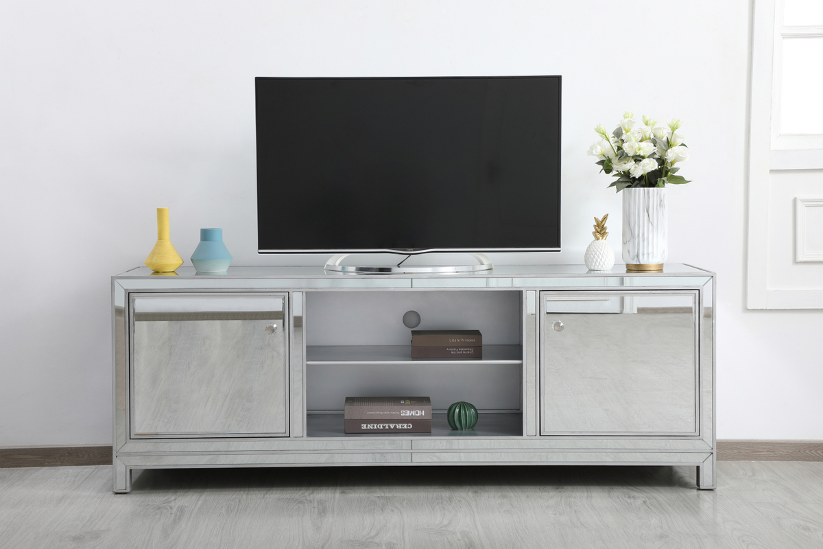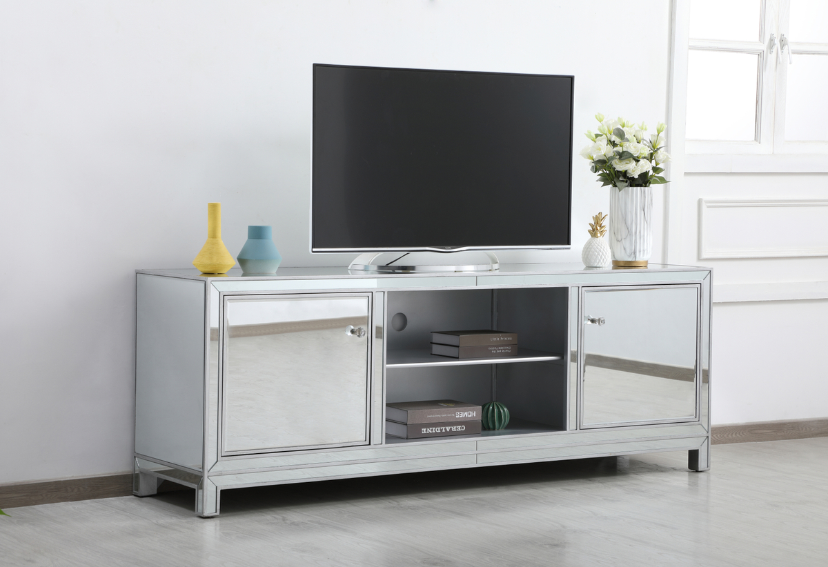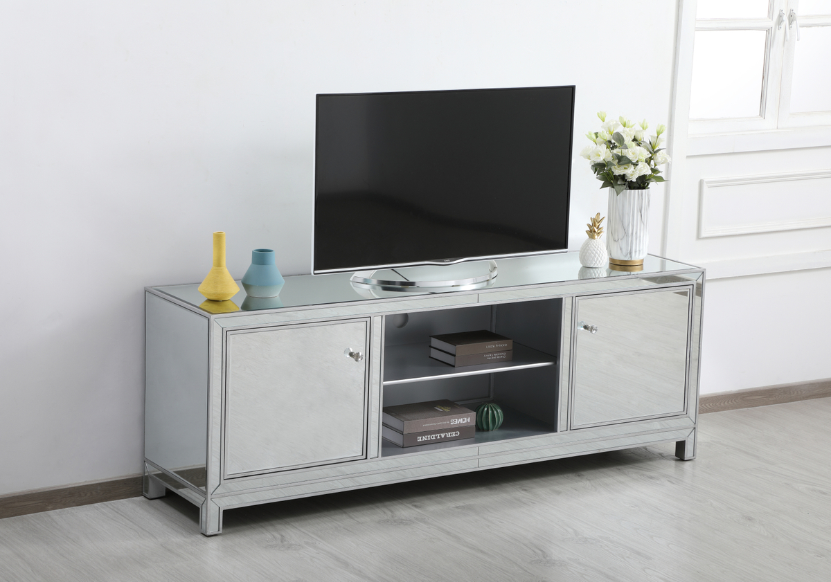 Sleek and vibrant, this modern media cabinet will make a striking statement in any room can showcase up to a 65″ flat screen TV at a perfect height. Featuring hand-rubbed silver finish, mirrored panels, and crystal knobs. Functional and chic, with 2 soft-closing side doors, center opening and shelvings, it provides plenty of storage for your equipment, games, and books. Ships fully assembled and ready to use. Remove the middle shelf and you can add our fireplace insert (sold separately) to turn this into a multi-functional storage unit.