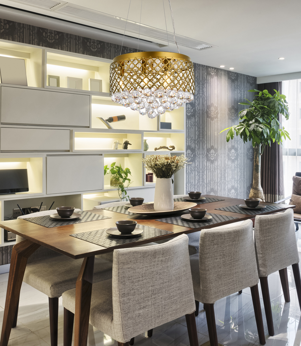 clear multi-faceted crystals reflect the soft glow of candelabra bulbs
