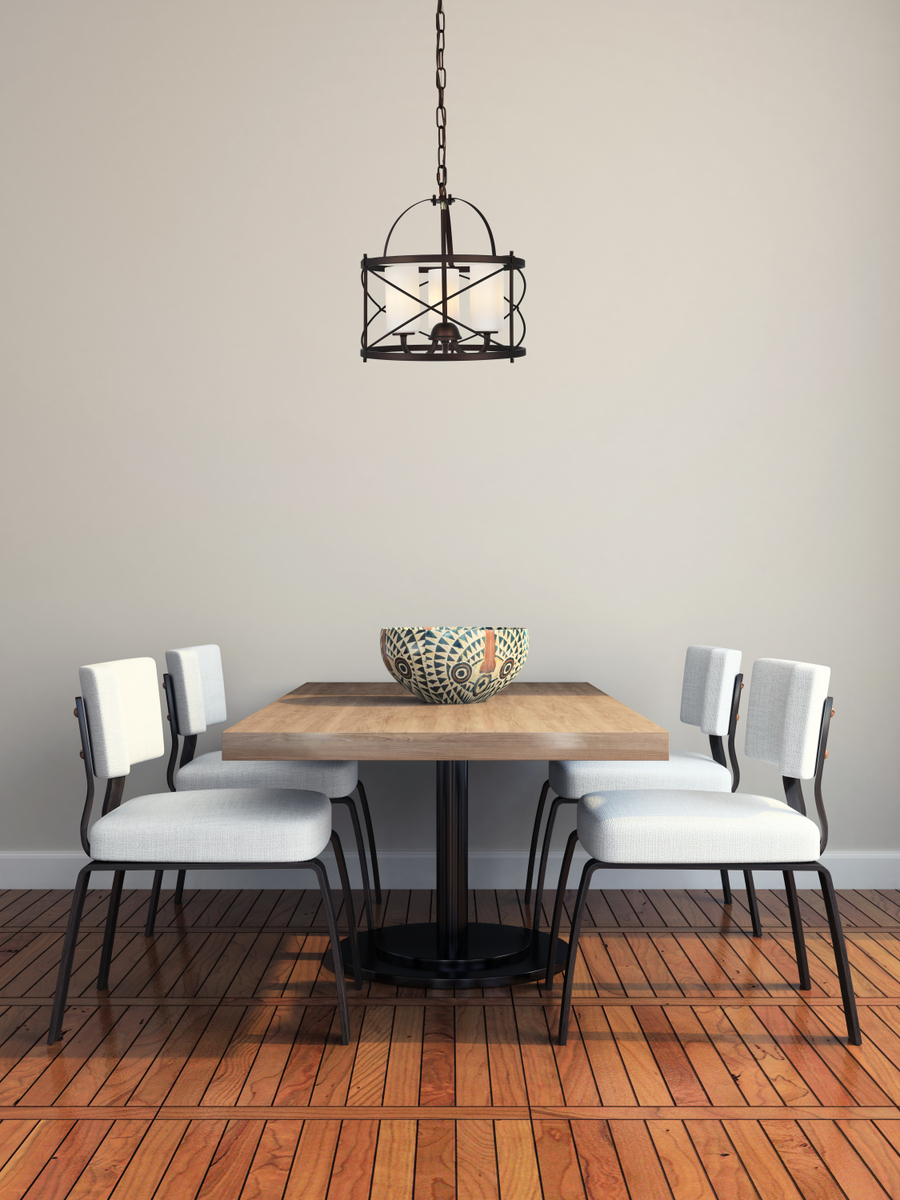 A playful composition with vintage appeal, Wren collection hanging fixtures are a unique blend of form and function. An oval Iron frame in a dark-copper brown finish connects to a stout chain and circular mounting fixture while Iron strips arch above and Iron Rods swirl around the sides. Nestled in the center, like eggs in a basket, three cylindrical frosted white Glass shades sit snugly atop curved arms. The perfect accompaniment for rustic or nautical décor in a living room, office, or bedroom.